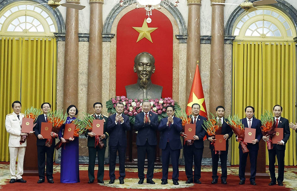 Tổng Bí thư, Chủ tịch nước Tô Lâm trao Quyết định bổ nhiệm cho 6 Phó Thủ tướng và Bộ trưởng Công an, Bộ trưởng Ngoại giao. Thủ tướng Lê Minh Hưng và nguyên Thủ tướng Phạm Minh Chính tặng hoa chúc mừng các đồng chí mới được bổ nhiệm - Ảnh: qdnd.vn