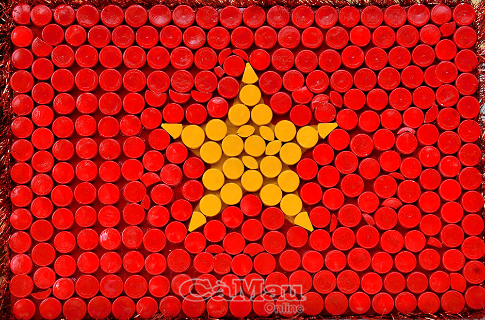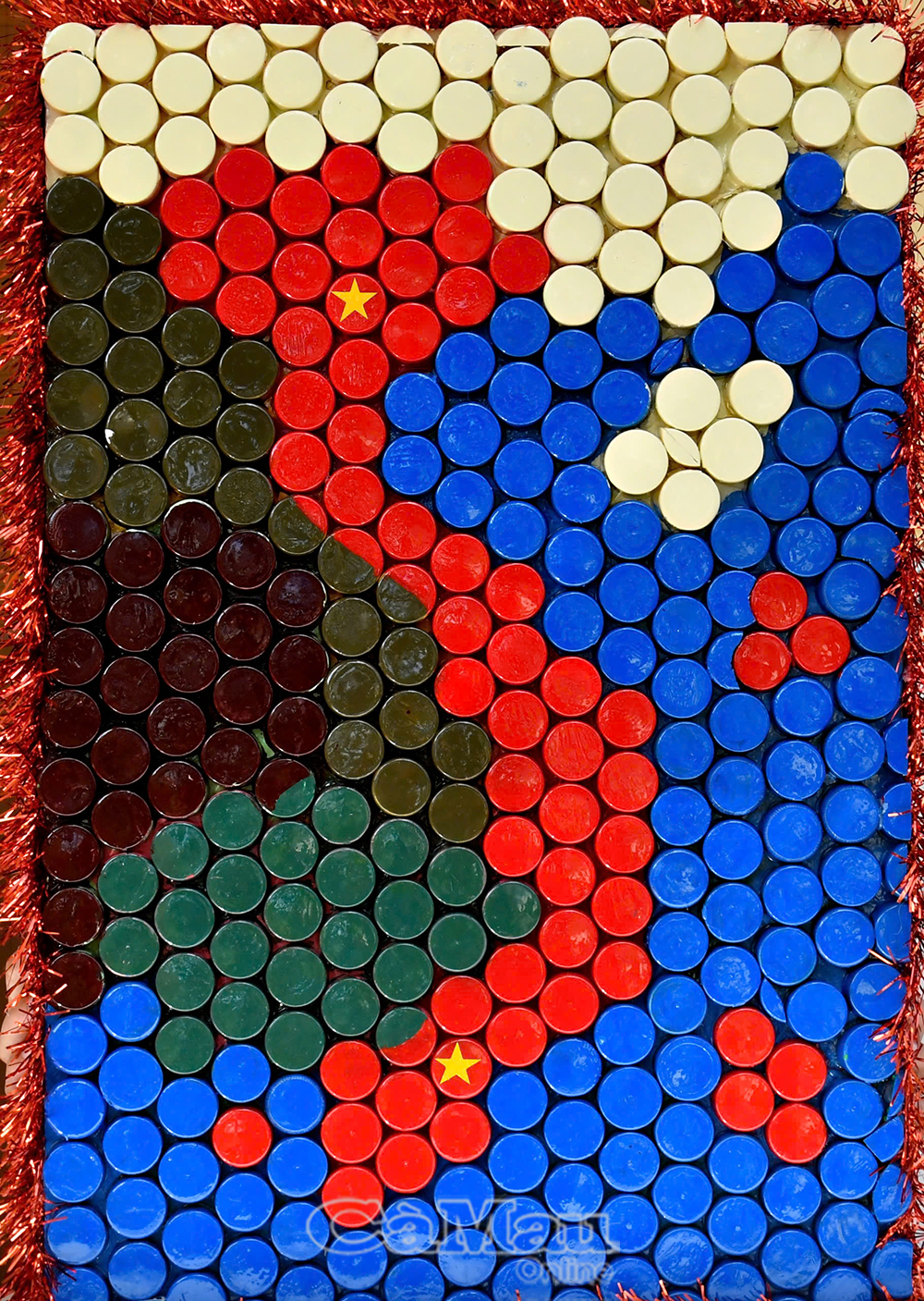 Những nắp chai nhựa được sơn màu, sắp xếp thành hình bản đồ, cờ Tổ quốc đầy ý nghĩa.