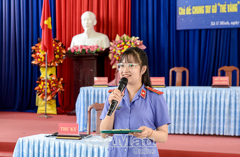 Chị Trương Thị Minh Đang, Phó Bí thư Chi đoàn VKSND tỉnh, thực hiện phần hỏi - đáp, tương tác tuyên truyền pháp luật đến đoàn viên và người dân.