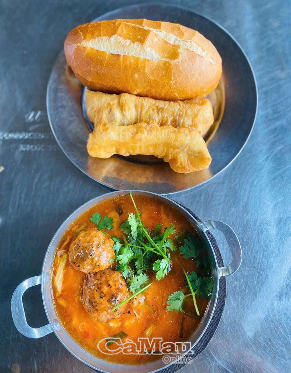 Bánh mì chảo ốp la trứng với xíu mại.