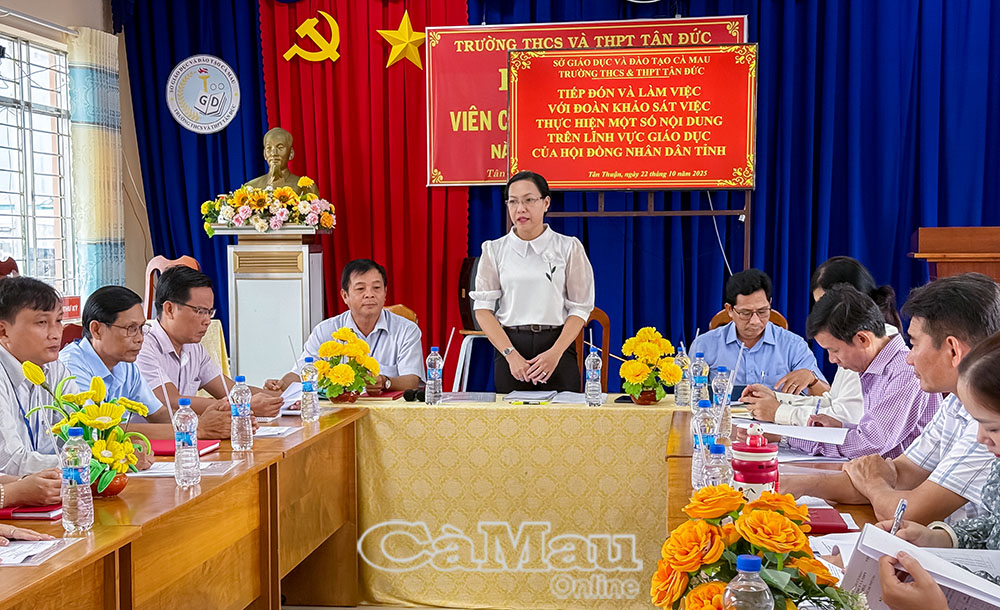 Báo Cà Mau Nhằm nắm bắt tình hình triển khai, thực hiện một số nội dung trong lĩnh vực giáo dục trên địa bàn tỉnh, sáng 22/10, Bà Trần Thị Huỳnh Dao, Trưởng Ban Văn hóa - Xã hội HĐND tỉnh cùng đoàn công tác đã đến khảo sát  và làm việc với lãnh đạo các trường học tại 2 xã Tân Thuận và Gành Hào.