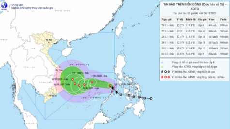 Trong khoảng ngày 27-28/11, khu vực giữa biển Đông (bao gồm vùng biển phía Bắc đặc khu Trường Sa) có khả năng chịu tác động của gió mạnh cấp 11, giật cấp 14, sóng biển cao 7,0-9,0 m, biển động dữ dội.