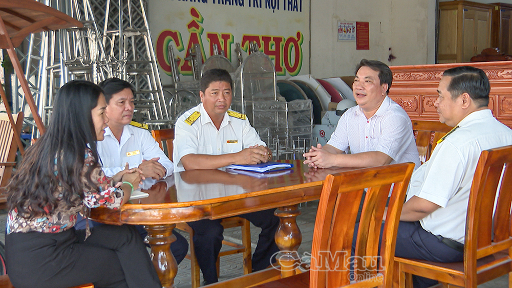 Cán bộ Thuế cơ sở 2 (Thuế tỉnh Cà Mau) triển khai việc chuyển đổi từ thuế khoán sang thuế kê khai cho hộ kinh doanh cửa hàng nội thất Cần Thơ (phường Bạc Liêu).