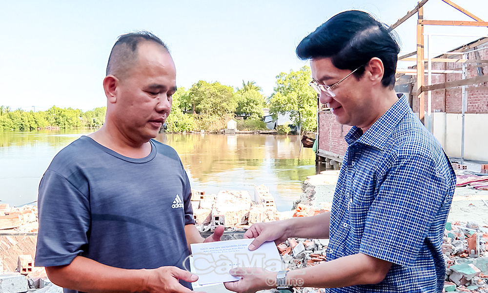 Bí thư Đảng uỷ phường Tân Thành Trương Đăng Khoa trao tiền hỗ trợ cho ông Lâm Thanh Tường, hộ dân bị thiệt hại hoàn toàn do sạt lở.