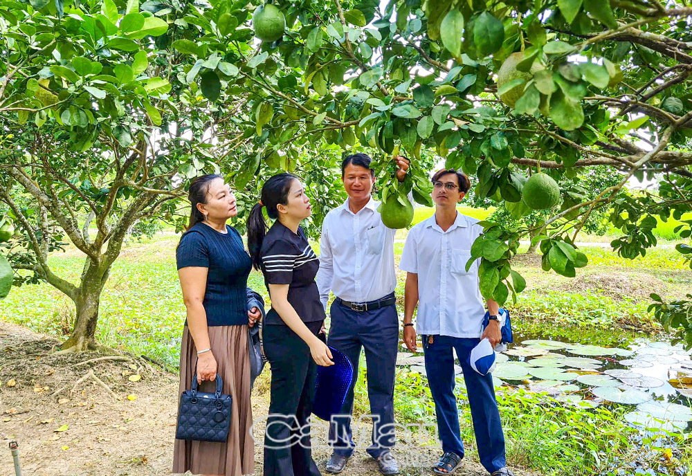 Đoàn cán bộ Viện Khoa học Công nghệ và Môi trường và Liên minh HTX tỉnh Cà Mau tham quan vườn bưởi da xanh của thành viên HTX Trái cây sạch Khánh Hưng.
