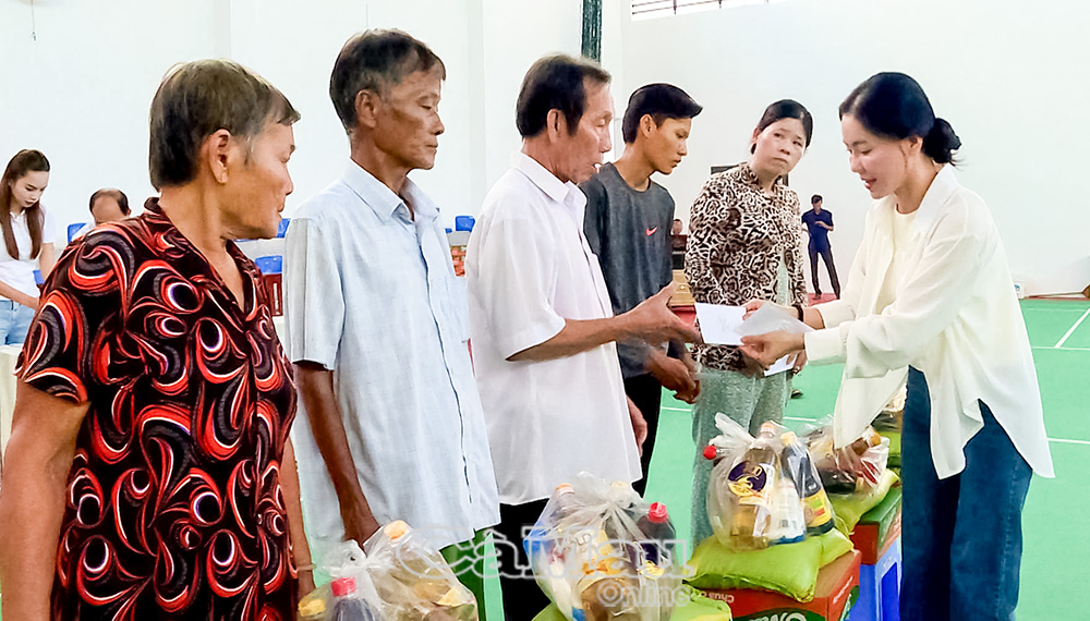 Bà Phạm Kim Dung, Tổng Giám đốc Công ty Cổ phần Quảng cáo Thương mại Sen Vàng trực tiếp trao quà cho các hộ dân.
