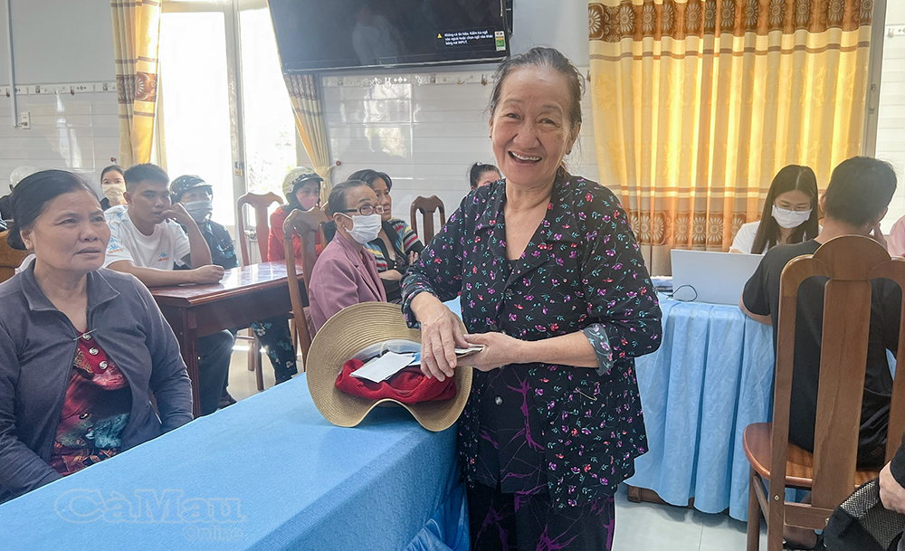 Niềm vui hiện rõ trên gương mặt của bà Nguyễn Thị Xia (Ấp 1) khi nhận lại tiền đóng bảo hiểm y tế. Ảnh Trúc Linh.