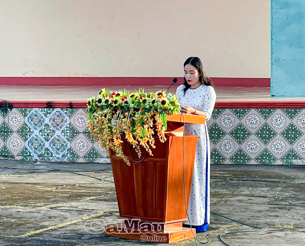 Trong không khí trang nghiêm, toàn thể đại biểu cùng hát vang Quốc ca. Tiếp đó, hơn 1.000 cán bộ, đảng viên, công chức, viên chức và Nhân dân địa phương tham dự đã được nghe đoàn viên Lâm Huỳnh Nguyên Thảo kể mẫu chuyện “Chiếc đồng hồ”.