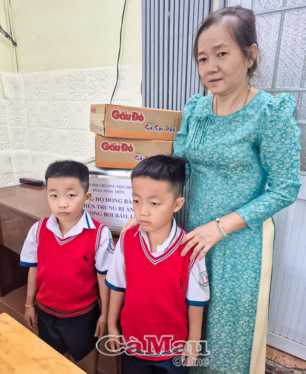 Em Huỳnh Thái Gia Vĩnh, lớp 1B, Trường Tiểu học Phan Ngọc Hiển, chia sẻ với ánh mắt đầy chân thành: “Hai anh em con góp 2 thùng mì. Con mong các bạn ngoài đó sẽ sớm có đồ ăn ngon, nước sạch và được đi học lại”.