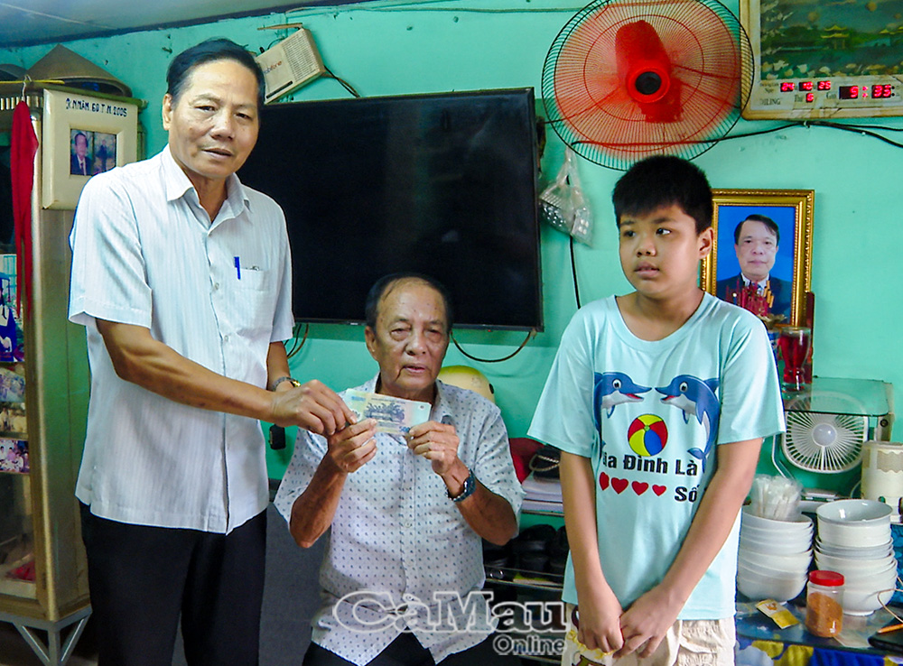 Ông Lê Quốc Văn, Chủ tịch Hội Chữ thập đỏ tỉnh, trao tiền hỗ trợ cho hai ông cháu em Nguyễn Duy Khánh.