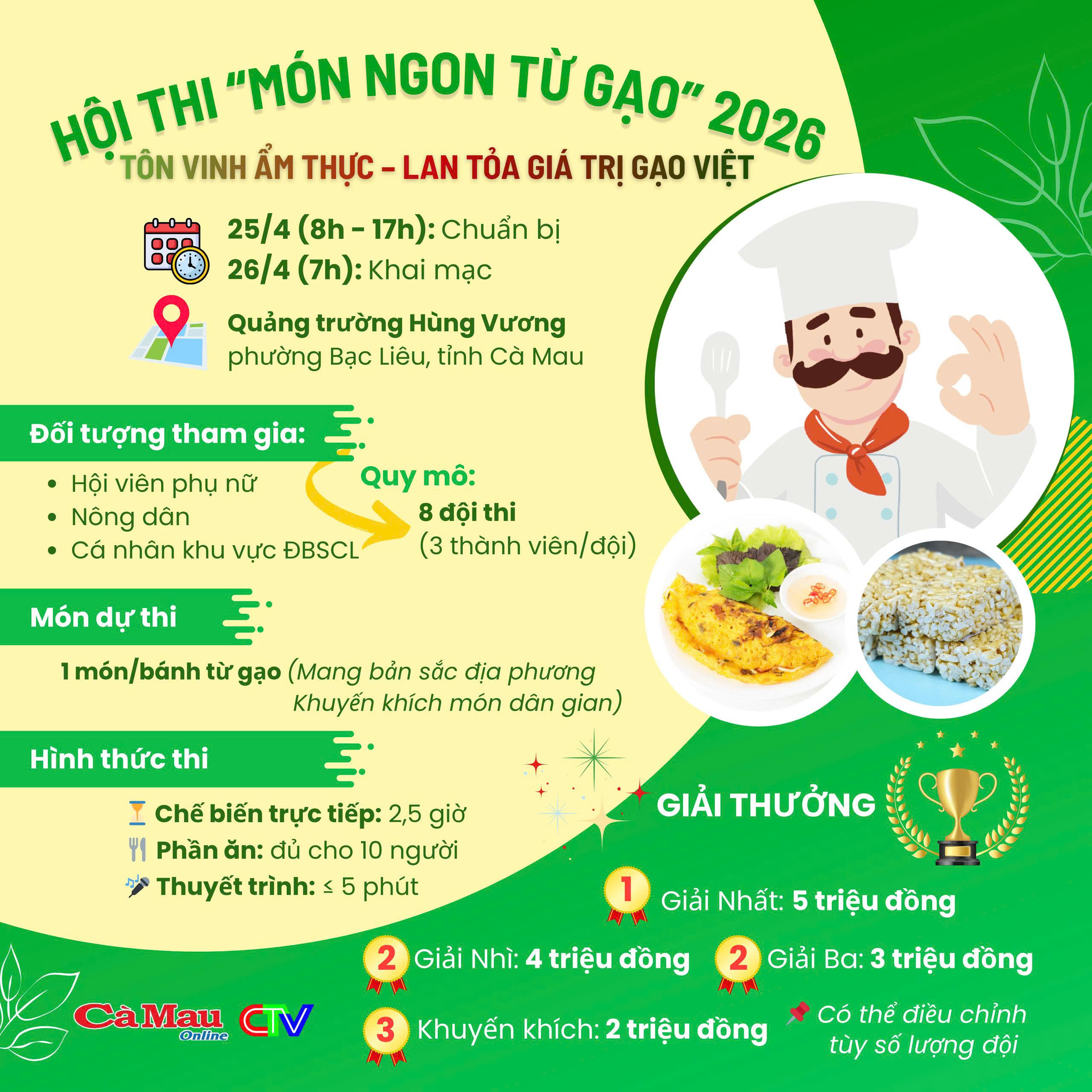 Tỉnh Cà Mau sẽ tổ chức Ngày hội Bánh dân gian Nam Bộ năm 2026 tại 2 điểm: Quảng trường Thanh Niên (phường Tân Thành) và Quảng trường Hùng Vương (phường Bạc Liêu), kết hợp Hội chợ xúc tiến thương mại - sản phẩm OCOP và ẩm thực. Thời gian dự kiến từ ngày 25/4-3/5.