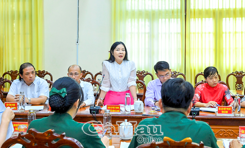 Bà Cao Xuân Thu Ngọc, Phó Giám đốc Báo và phát thanh, truyền hình Cà Mau, trao đổi một số nội dung liên quan đến công tác tuyên truyền các hoạt động của hội trại.