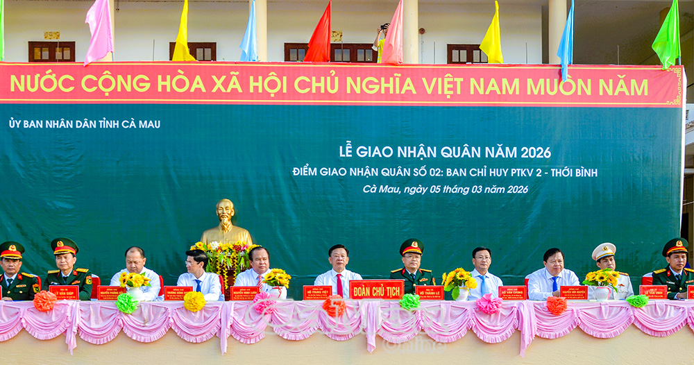 Hoà chung không khí ngày hội tòng quân của nhiều địa phương trong cả nước, sáng 5/3, UBND tỉnh Cà Mau tổ chức thành công tốt đẹp Lễ giao, nhận quân năm 2026 đồng loạt tại 6 điểm giao quân trên địa bàn tỉnh.