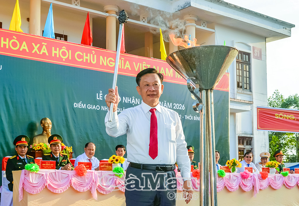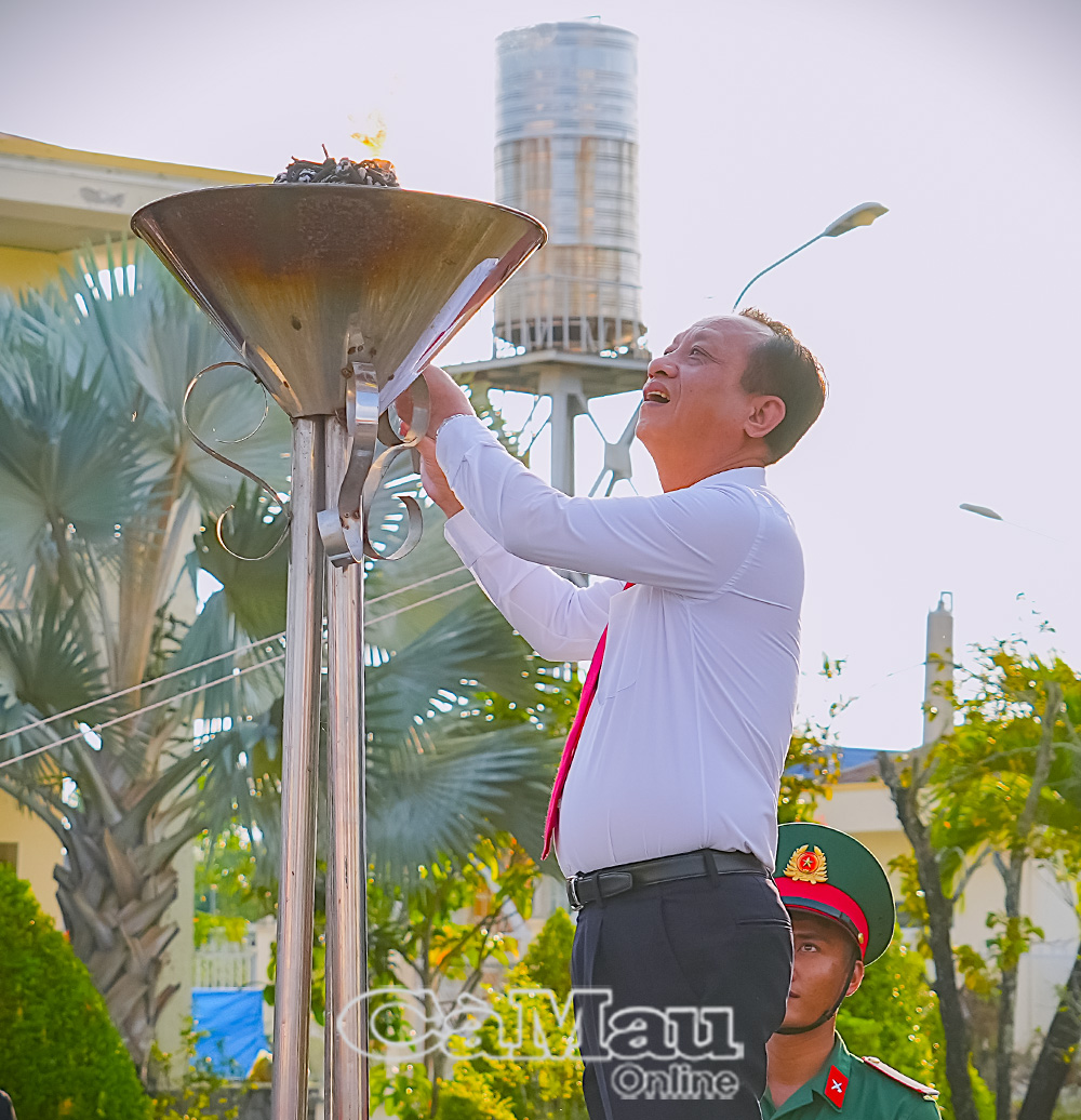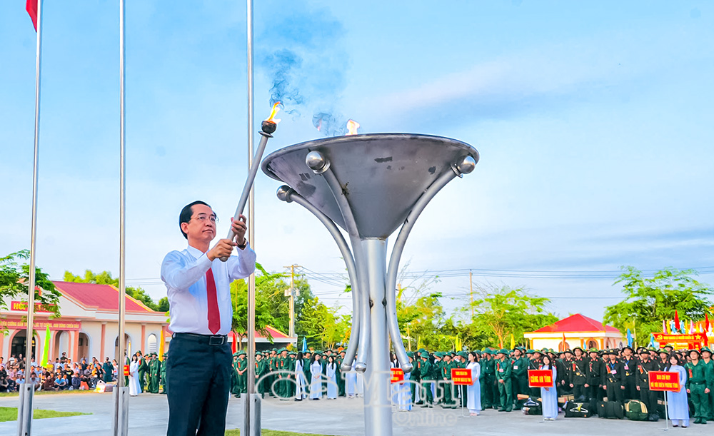 Đồng chí Hồ Thanh Thuỷ, Phó Bí thư Tỉnh uỷ, Chủ tịch Uỷ ban MTTQ Việt Nam tỉnh Cà Mau, thực hiện nghi thức thắp lửa truyền thống, động viên thanh niên hăng hái lên đường nhập ngũ, hoàn thành tốt nhiệm vụ được giao.