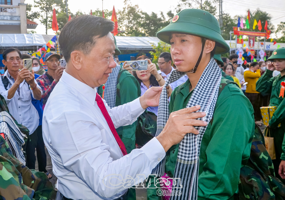 Chủ tịch HĐND tỉnh Phạm Văn Thiều quàng khăn rằn, động viên tân binh.