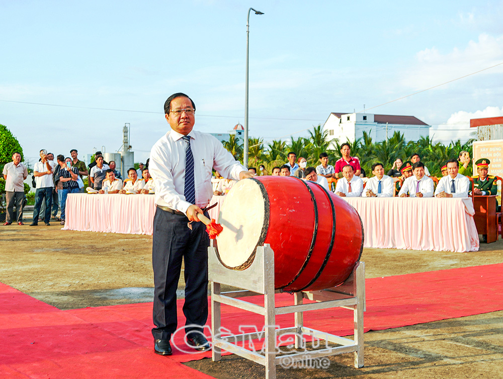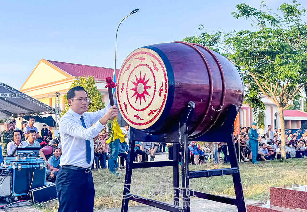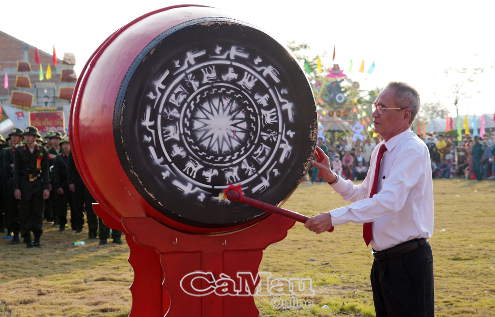 Phó Chủ tịch Thường trực Uỷ ban MTTQ Việt Nam tỉnh Cà Mau Lê Thanh Triều đánh trống mở hội tòng quân.