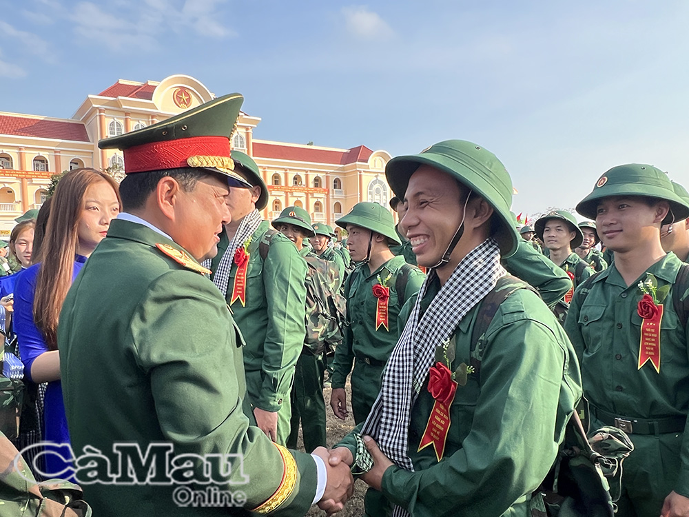 Lãnh đạo Quân khu 9 và tỉnh Cà Mau chào tiễn, động viên thanh niên vững tin lên đường bảo vệ Tổ quốc.