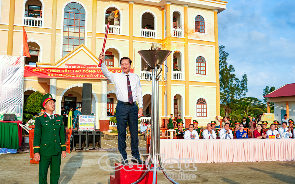 Đồng chí Hồ Trung Việt,Trưởng ban Tuyên giáo và Dân vận Tỉnh uỷ, thực hiện nghi thức thắp lửa truyền thống như thắp lên niềm vinh dự, tự hào, tinh thần hăng hái của tuổi trẻ Cà Mau thực hiện nghĩa vụ đối với Tổ quốc.