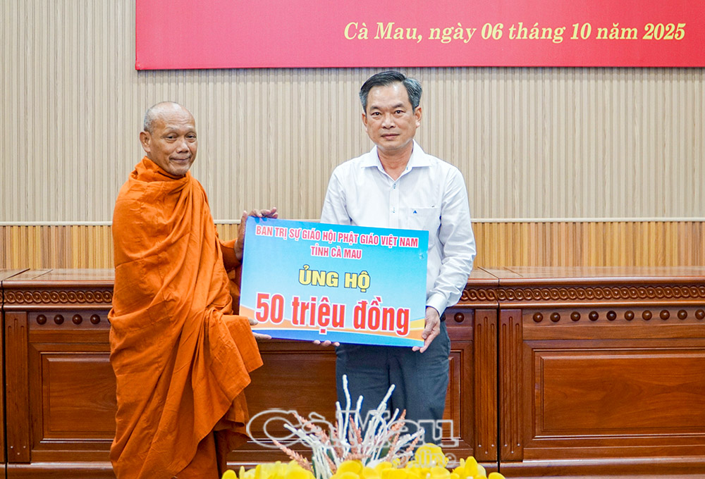 Ban Trị sự Giáo hội Phật giáo Việt Nam tỉnh Cà Mau trao biểu trưng ủng hộ 50 triệu đồng.