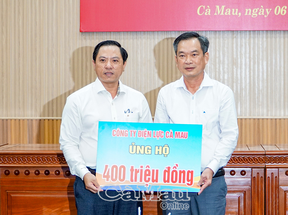 Công ty Điện lực tỉnh Cà Mau trao biểu trưng ủng hộ 400 triệu đồng hướng về đồng bào bị thiệt hại do bão số 10 gây ra.