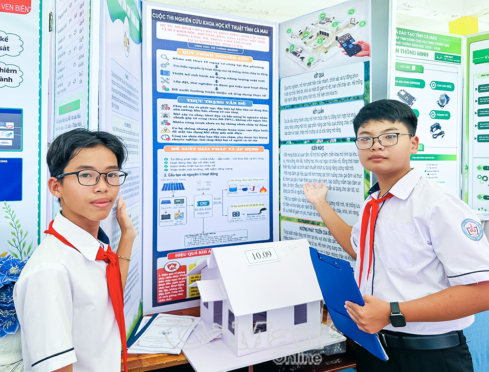 Em Lâm Phạm Duy, Trường Tiểu học và THCS Nguyễn Bỉnh Khiêm, xã U Minh, chia sẻ: “Sinh ra và lớn lên ở vùng đất rừng U Minh, em luôn trăn trở về việc làm sao để bảo vệ rừng tốt hơn. Do đó, em và các bạn đã nghiên cứu và thử nghiệm thành công dự án “mô hình chữa cháy tự động”. Dự án này có tính năng cảm biến nhiệt, khi phát hiện nguy cơ hệ thống sẽ tự động bơm nước để dập lửa ngay từ lúc đám cháy vừa khởi phát. Đồng thời, thiết bị sẽ gửi thông báo khẩn cấp cùng toạ độ chính xác về điện thoại của lực lượng chức năng”.