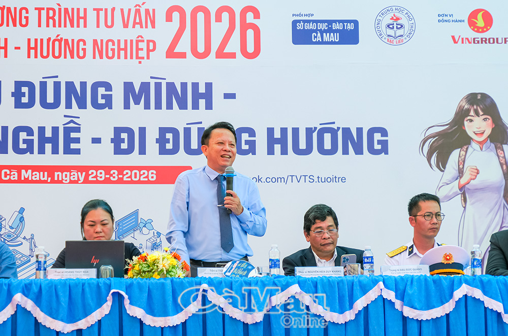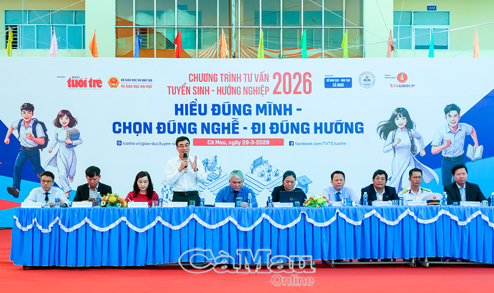 Ngày 23/3, tại Trung tâm Văn hóa tỉnh (phường Bạc Liêu), chương trình tư vấn hướng nghiệp, xét tuyển đại học, cao đẳng năm 2026 với chủ đề “Tiếp bước trường thi” diễn ra sôi nổi. Chương trình do Tạp chí Giáo dục TP Hồ Chí Minh phối hợp với Báo và phát thanh, truyền hình Cà Mau, Sở GD&ĐT tỉnh Cà Mau và VNPT Cà Mau tổ chức.