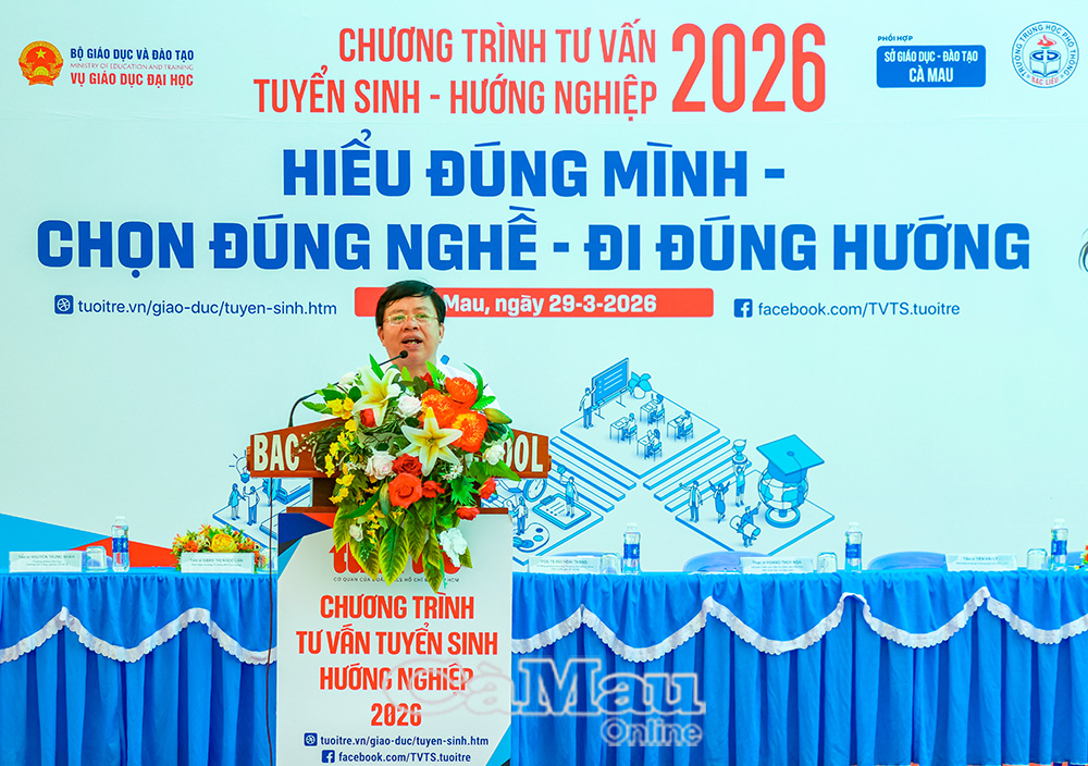 Báo Cà Mau Sáng 29/3, chương trình Tư vấn tuyển sinh - hướng nghiệp năm 2026 do Báo Tuổi Trẻ phối hợp với Vụ Giáo dục đại học (Bộ Giáo dục và Đào tạo), Sở Giáo dục và Đào tạo tỉnh Cà Mau tổ chức tại Trường THPT Bạc Liêu (phường Bạc Liêu) thu hút hơn 3.000 học sinh và phụ huynh tham dự.