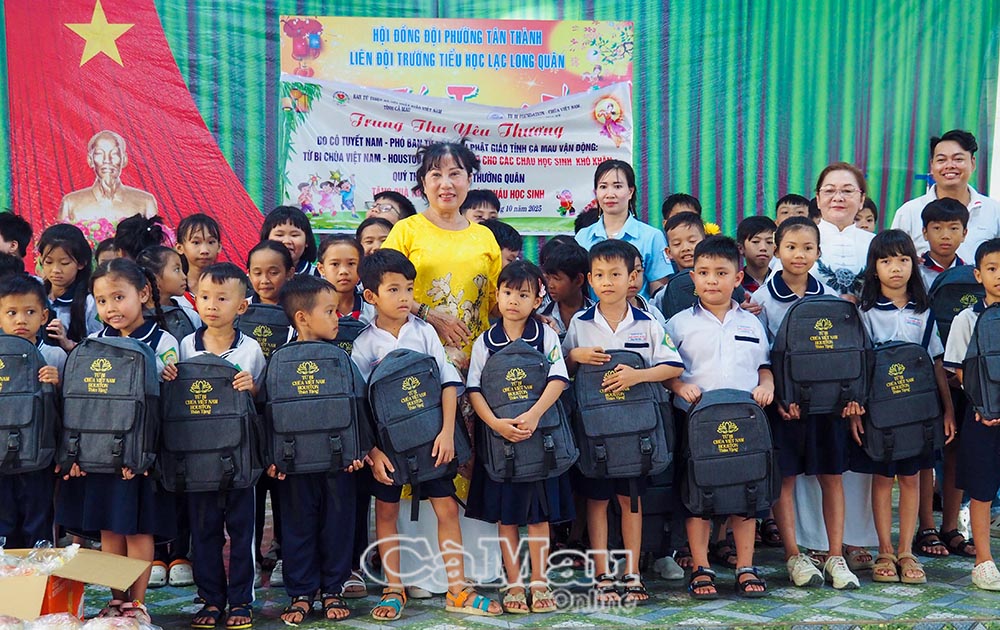 Bà Nguyễn Thị Ánh Tuyết (Tuyết Nam), Phó Ban Từ thiện Xã hội Phật giáo tỉnh Cà Mau, cùng mạnh thường quân trao ba lô cho học sinh có hoàn cảnh khó khăn và quà bánh Trung thu cho các em học sinh.