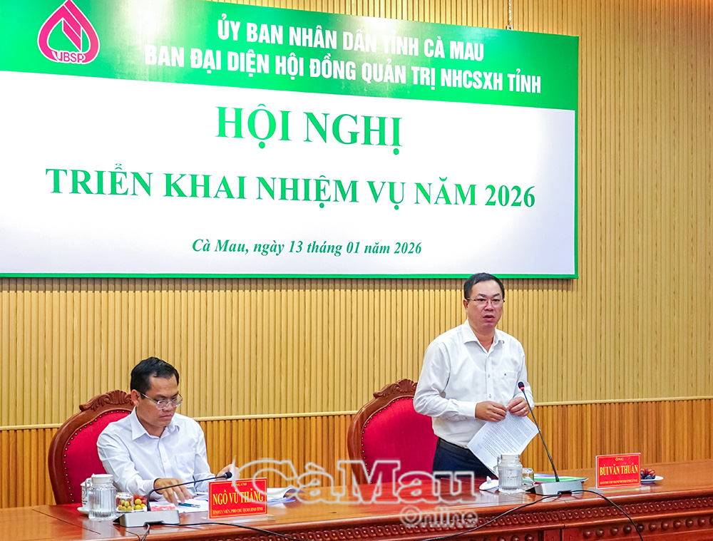 Báo Cà Mau Sáng 13/1, Phó Chủ tịch UBND tỉnh Cà Mau Ngô Vũ Thăng, Trưởng ban đại diện Hội đồng quản trị Ngân hàng Chính sách xã hội (NHCSXH) tỉnh, chủ trì hội nghị triển khai nhiệm vụ năm 2026.
