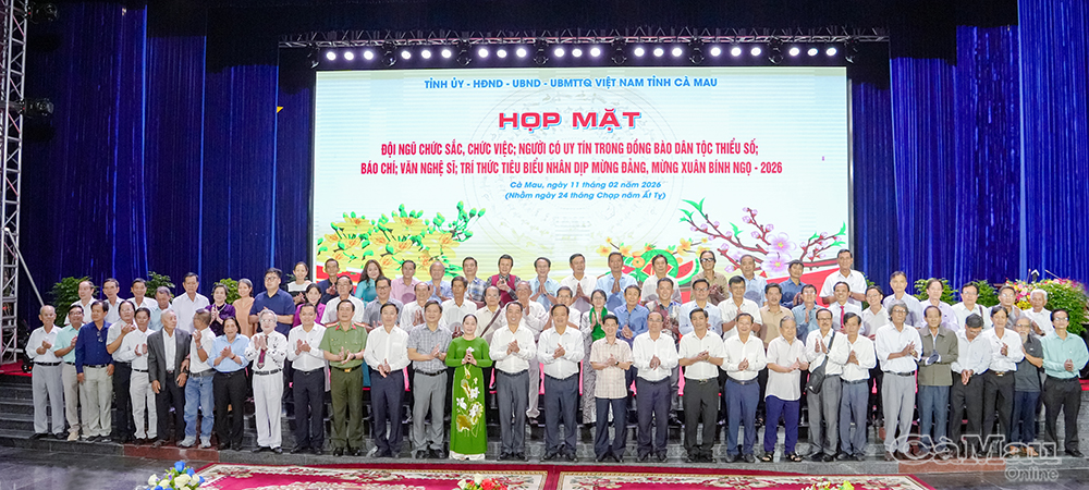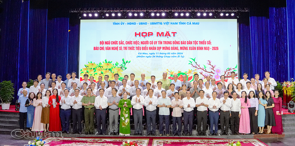 Chiều 11/2 (24 Tết), Tỉnh uỷ - HĐND - UBND - Uỷ ban MTTQ Việt Nam tỉnh Cà Mau tổ chức buổi họp mặt đội ngũ chức sắc, chức việc; người có uy tín trong đồng bào dân tộc thiểu số; báo chí; văn nghệ sĩ và trí thức tiêu biểu trong tỉnh nhân dịp mừng Đảng, mừng Xuân Bính Ngọ 2026.
