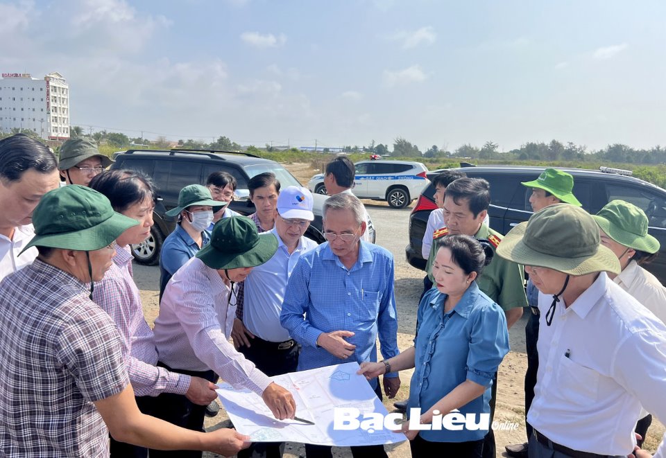 Lãnh đạo tỉnh nghe báo cáo vị trí xây dựng công trình biểu tượng con tôm Bạc Liêu.