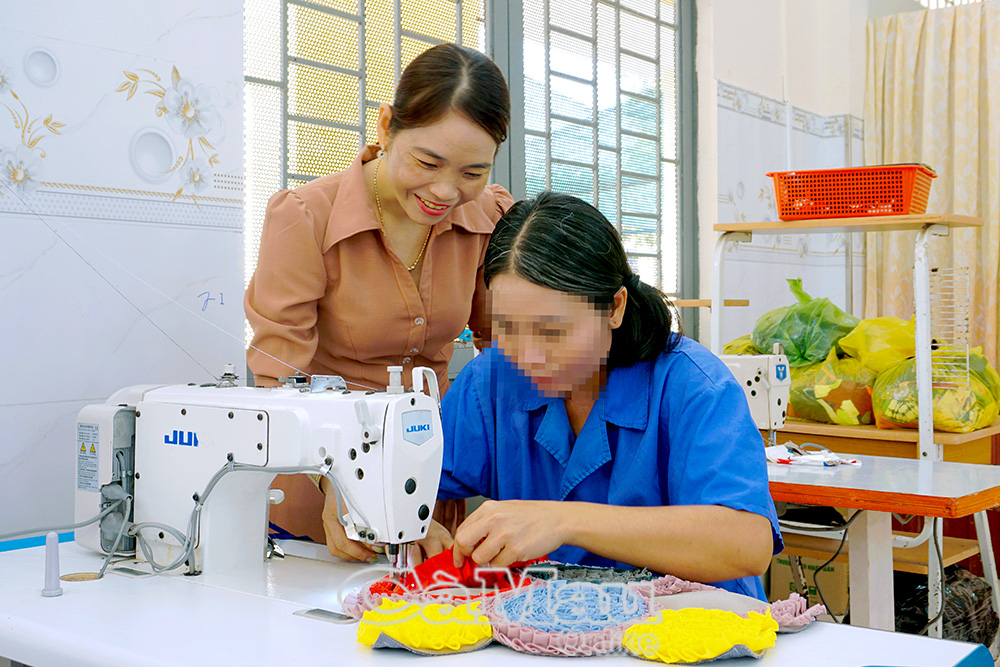 Hướng dẫn bệnh nhân học nghề may trong quá trình phục hồi chức năng. Ảnh: MỸ TRÂM