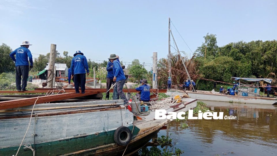 Cán bộ, đoàn viên, hội viên thị trấn Ngan Dừa cùng Đội tình nguyện xây dựng cầu. Ảnh: T.H