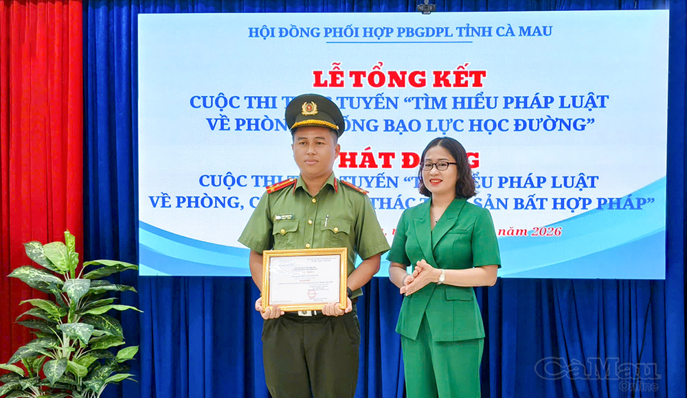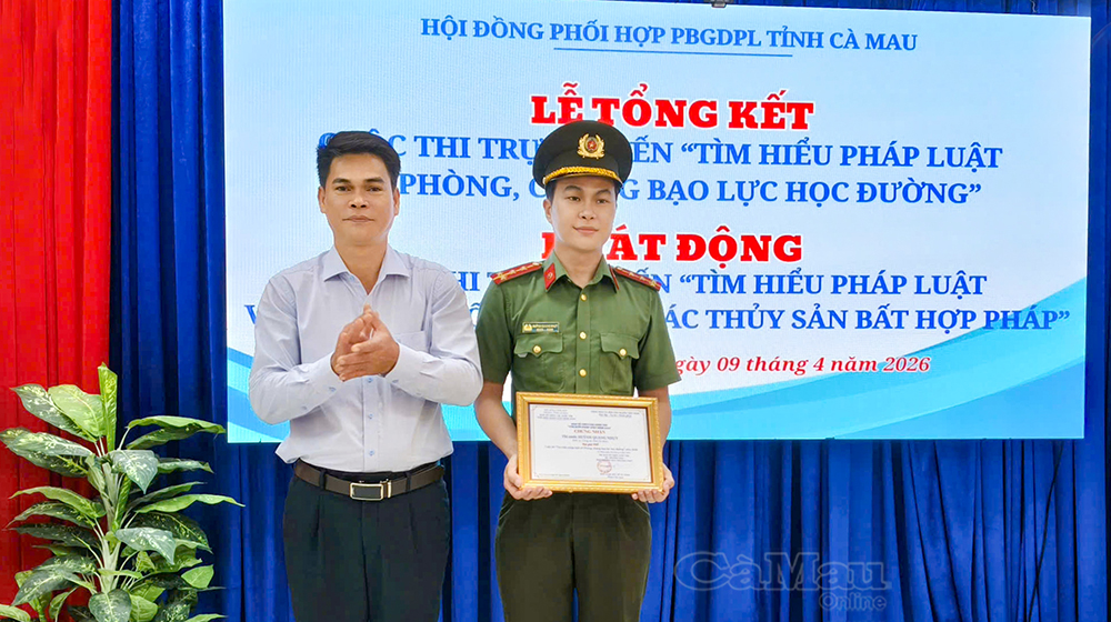 Báo Cà Mau Sáng 9/4, Hội đồng phối hợp phổ biến giáo dục pháp luật tỉnh Cà Mau, Ban tổ chức cuộc thi đã tổ chức Lễ trao giải Cuộc thi trực tuyến “Tìm hiểu pháp luật về phòng, chống bạo lực học đường”, đồng thời phát động Cuộc thi trực tuyến “Tìm hiểu pháp luật về phòng, chống khai thác thuỷ sản bất hợp pháp”.