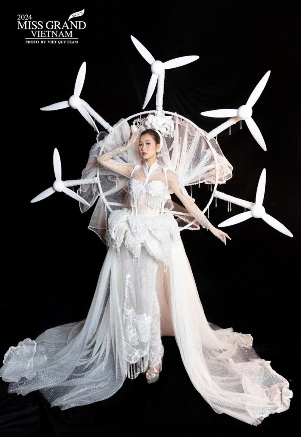 Trang phục “Ðiện gió Bạc Liêu” trong phần chụp hình sân khấu, lan toả thông điệp văn hoá - năng lượng xanh. (Ảnh nhân vật cung cấp)