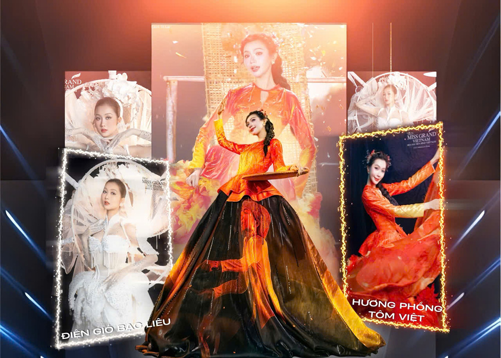 Cẩm Ly, Á hậu 2 cuộc thi Hoa hậu Quốc gia Việt Nam 2024, diện trang phục “Hương phồng tôm Việt” trong buổi chụp hình tại The Grand National Costume 2025. (Ảnh nhân vật cung cấp)
