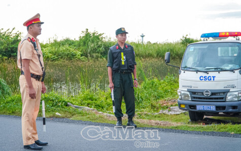 Lực lượng Cảnh sát giao thông kết hợp lực lượng Cảnh sát cơ động, Công an tỉnh Cà Mau trong công tác tuần tra, kiểm soát, bảo đảm trật tự, an toàn giao thông.