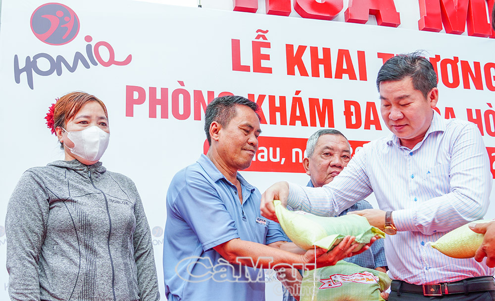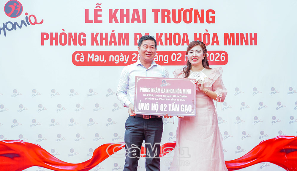 Dịp này, Phòng khám Đa khoa Hoà Minh trao bảng tượng trưng ủng hộ 2 tấn gạo cho ông Dương Minh Em, Bí thư Đảng uỷ Phường Lý Văn Lâm, hỗ trợ người dân có hoàn cảnh khó khăn.