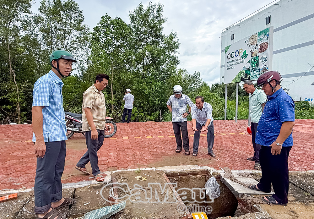 Chủ tịch UBND xã Năm Căn Võ Văn Hành (bìa phải), cùng lãnh đạo các cơ quan chuyên môn xã nắm tình hình hoạt động cống thoát nước trên đường Nguyễn Tất Thành (ngang Nghĩa trang Liệt sĩ Năm Căn).