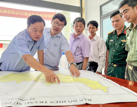 Đồng chí Huỳnh Quốc Việt, Phó Bí thư Thường trực Tỉnh uỷ, cùng đoàn công tác xem bản đồ quy hoạch trụ sở lực lượng vũ trang và trụ sở hành chính xã Vĩnh Lộc.