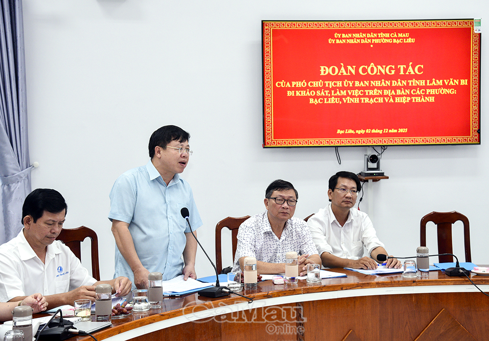 Chiều 2/12, Uỷ viên Ban Thường vụ Tỉnh uỷ, Phó Chủ tịch UBND tỉnh Cà Mau Lâm Văn Bi cùng đoàn công tác đã khảo sát và làm việc với các phường Bạc Liêu, Vĩnh Trạch và Hiệp Thành, nhằm nắm tình hình, tháo gỡ khó khăn và đẩy mạnh sắp xếp, xử lý tài sản công dôi dư, gồm nhà và đất.