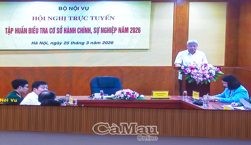 Sáng 25/3, Thứ trưởng Bộ Nội vụ Nguyễn Mạnh Khương, Trưởng ban Thường trực Ban Chỉ đạo điều tra cơ sở hành chính, sự nghiệp Trung ương, chủ trì hội nghị trực tuyến toàn quốc tập huấn nghiệp vụ kỳ điều tra năm 2026. Tại điểm cầu Cà Mau, hơn 200 đại biểu là thành viên Ban Chỉ đạo tỉnh và cán bộ, công chức, viên chức làm đầu mối thực hiện nhiệm vụ điều tra của các cơ quan, đơn vị trên địa bàn tỉnh tham dự.