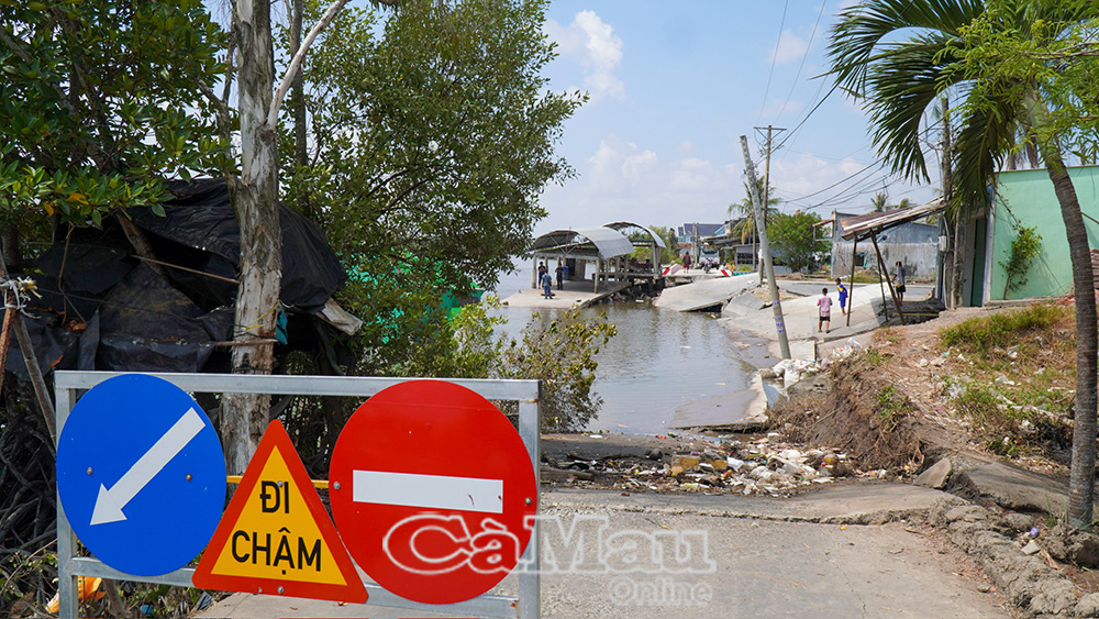 Cũng trong sáng nay, đoàn đến khảo sát tuyến Đầm Dơi - Tân Dân (đoạn gần cầu Thợ Tĩnh). Đây là vị trí từng được địa phương chỉ đạo khắc phục tạm bằng kè mềm và rọ đá, tuy nhiên sau hơn một năm, khu vực này lại tiếp tục xuất hiện nhiều vết nứt, nền đường mất ổn định và có nguy cơ sạt lở rất cao. Theo báo cáo của UBND xã Đầm Dơi, từ đầu năm đến nay, trên địa bàn xã đã xảy ra 22 vụ sạt lở, tổng thiệt hại ước tính trên 4,6 tỷ đồng. Hiện nay, toàn xã vẫn còn 9 vị trí có nguy cơ sạt lở, ước thiệt hại khoảng 4 tỷ đồng nếu không có biện pháp ngăn chặn kịp thời.