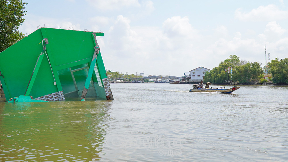Cửa hàng thức ăn thuỷ sản bị cuốn xuống lòng sông sau vụ sạt lở xảy ra vào ngày 24/4.