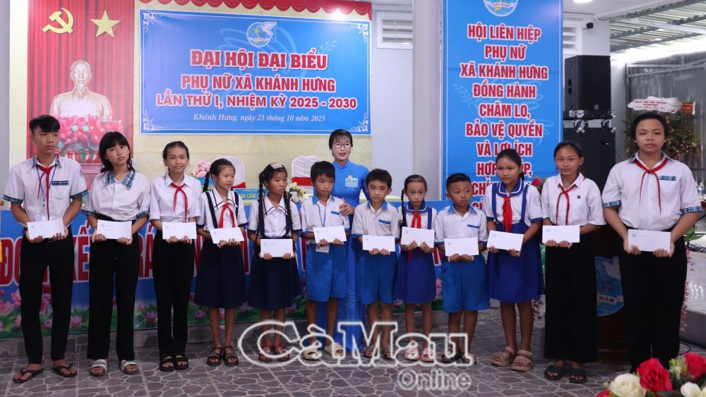 Em Trần Lan Anh (thứ 2 từ phải qua) nhận học bổng 20/10 do Hội LHPN xã Khánh Hưng trao tặng tại Đại hội đại biểu phụ nữ xã được tổ chức vào cuối tháng 10/2025 vừa qua.