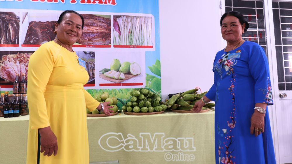 Bà Quách Thị Kim Luông (áo vàng) cùng hội viên tham gia trưng bày sản phẩm tại Đại hội đại biểu phụ nữ xã Khánh Hưng, nhiệm kỳ 2025-2030.