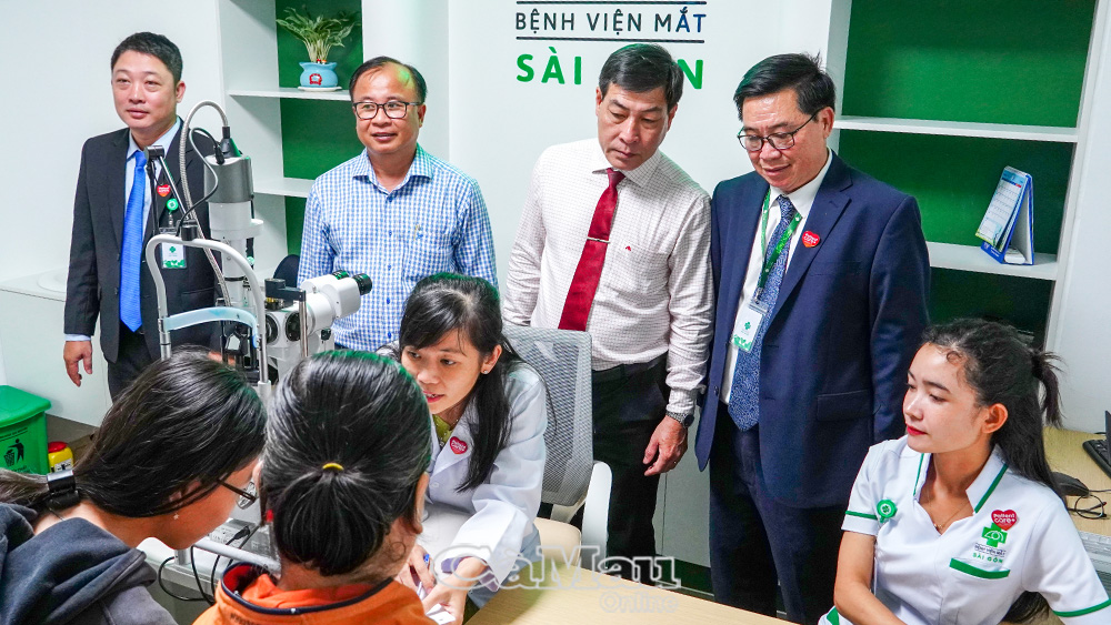 Đại diện lãnh đạo Sở Y tế, Tập đoàn Y khoa Sài Gòn và Bệnh viện Mắt Sài Gòn Minh Hải tham quan cơ sở vật chất, quy trình khám tại Bệnh viện Mắt Sài Gòn Minh Hải.