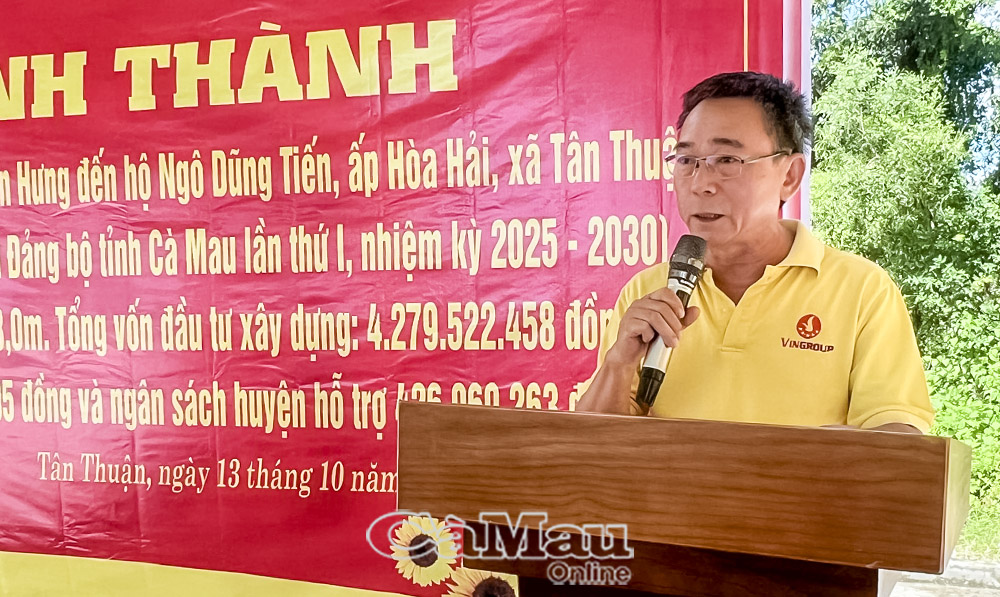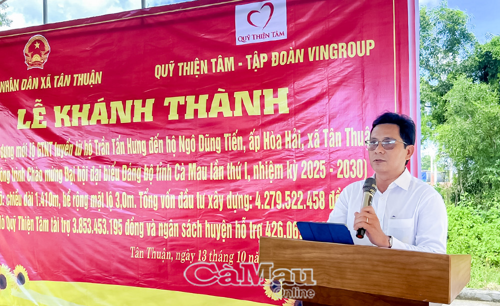 Phát biểu tại buổi lễ, ông Phan Minh Khoẻ, Chủ tịch UBND xã Tân Thuận, trân trọng ghi nhận và cảm ơn sự hỗ trợ quý báu của Quỹ Thiện Tâm - Tập đoàn Vingroup, đồng thời kêu gọi người dân tiếp tục phát huy tinh thần đoàn kết, tích cực bảo quản, giữ gìn công trình, cùng chung tay xây dựng quê hương ngày càng giàu đẹp, văn minh.