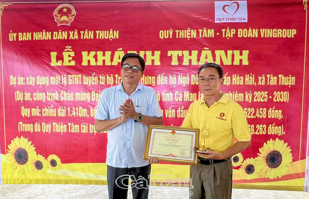 Ông Phạm Thanh Phong, Bí thư Đảng uỷ xã Tân Thuận, trao bằng khen của UBND tỉnh Cà Mau cho ông Nguyễn Đắc Vinh, đại diện Quỹ Thiện Tâm - Tập đoàn Vingroup vì có nhiều đóng góp trong công tác an sinh xã hội.