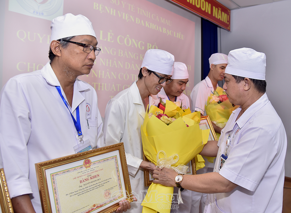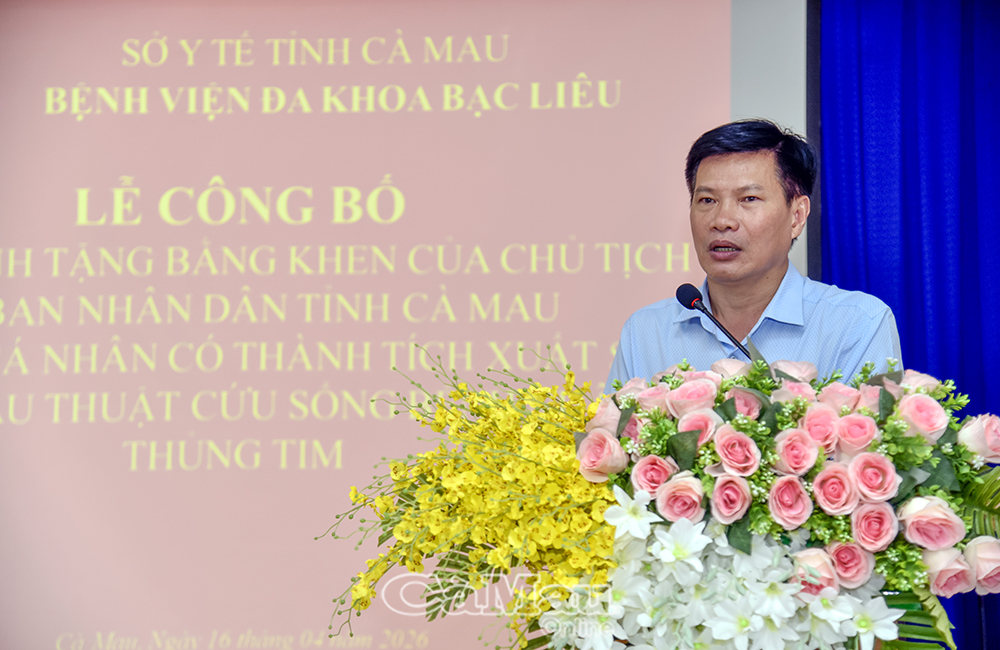 Báo Cà Mau Chiều 16/4, Bệnh viện Đa khoa Bạc Liêu (tỉnh Cà Mau) tổ chức lễ công bố quyết định của Chủ tịch UBND tỉnh về việc tặng Bằng khen cho các cá nhân có thành tích xuất sắc trong ca phẫu thuật cứu sống bệnh nhân bị thủng tim vừa qua. Dự buổi lễ có ông Nguyễn Tấn Lực, Phó Giám đốc Sở Y tế.